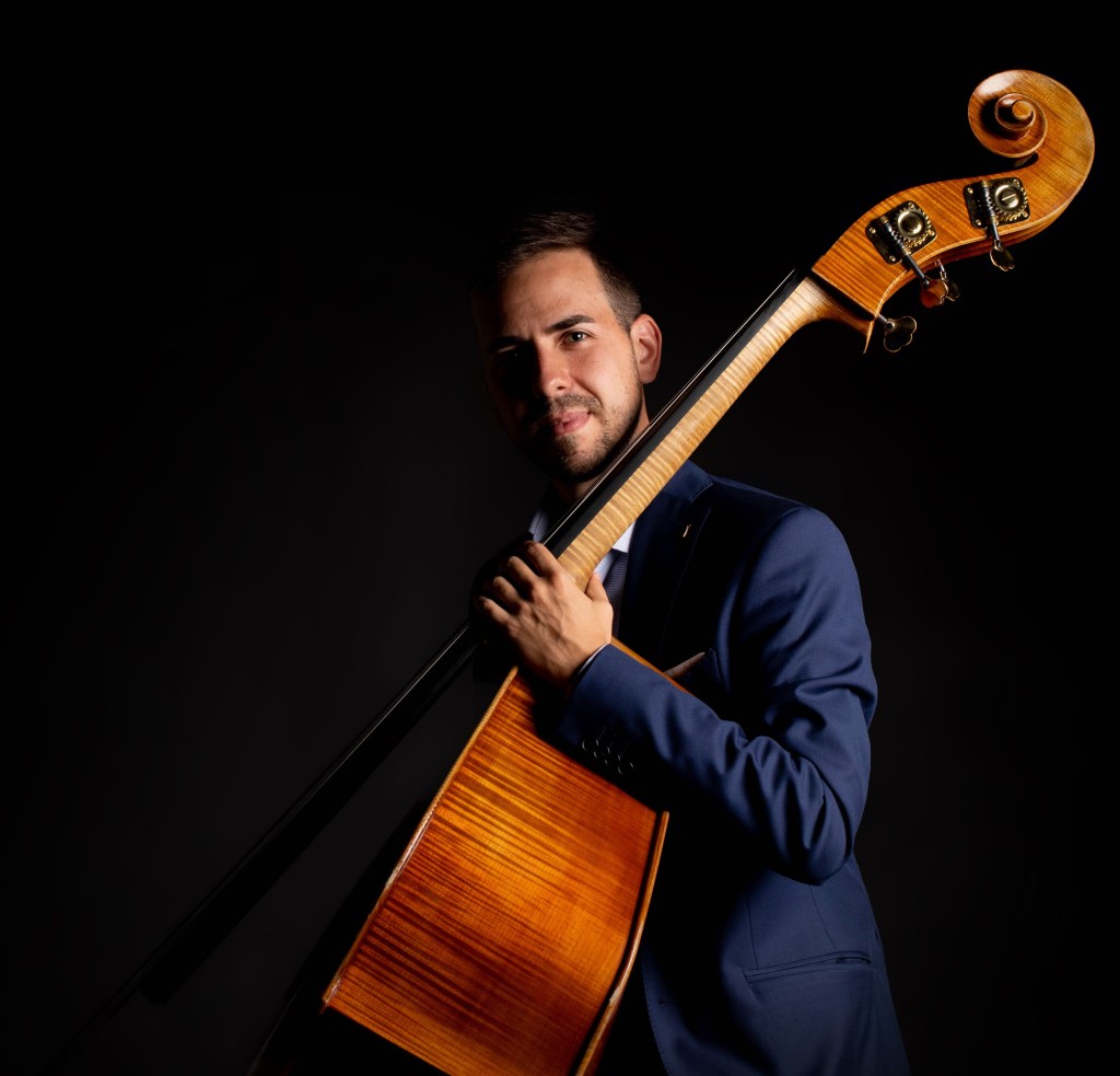 Toca con un contrabajo construido en la ciudad francesa de Mirecourt por el luthier Barbé “Père”, datado aproximadamente en torno al año 1800. Utiliza un arco francés fabricado por Ángel Martínez y un arco alemán elaborado por Luboš Oubrecht.